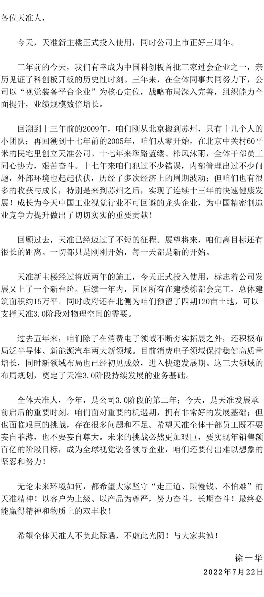 2022年7月22日,天准公司创始人董事长徐一华博士通过致全体员工邮件的方式宣布天准公司新主楼正式投入使用。